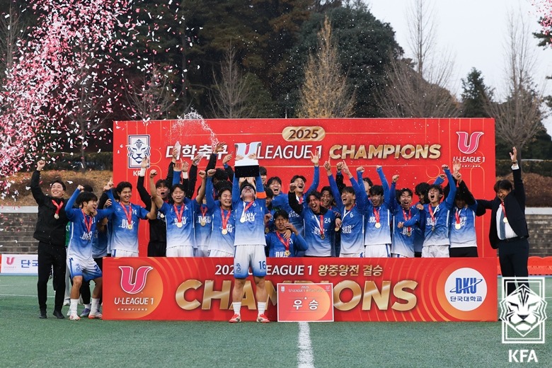 2025 U리그1 왕중왕전 정상에 오른 단국대의 우승 세레머니 장면.
