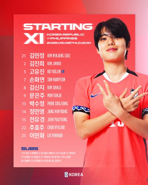 최전방에는 전유경(몰데FK)이 출격한다. 2선은 박수정(AC밀란) – 김신지(레인저스WFC) – 문은주(화천KSPO) – 손화연(강진WFC)으로 구성됐다. 수비형 미드필더는 정민영(오타와래피드FC)이 맡는다.
