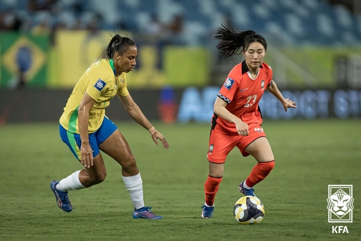 신상우 감독이 이끄는 여자대표팀(FIFA 랭킹 19위)은 12일 오전 10시 30분(이하 한국시간) 브라질 쿠이아바의 아레나 판타날에서 열린 브라질(FIFA 랭킹 8위)과의 ‘FIFA 시리즈 2026’ 1차전에서 1-5로 패배했다. 전반 종반까지는 상대의 공세를 잘 막았지만, 후반 들어 연달아 실점을 내주면서 무너졌다. 후반 42분에 나온 박수정의 만회골이 위안거리였다.