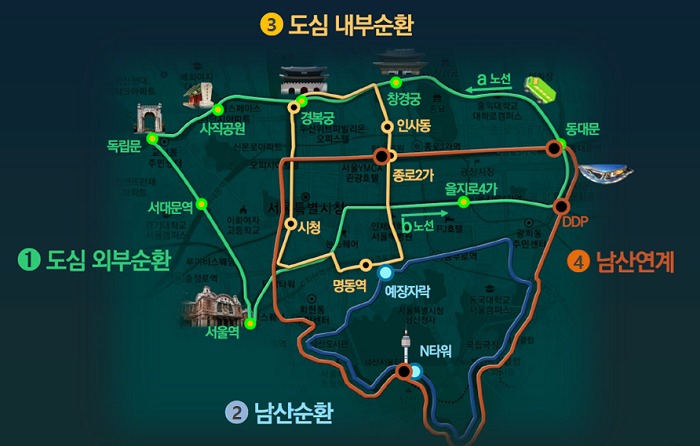 주요 노선으로는 남산공원, N타워 및 명동, 서울역, 인사동, 경복궁 등 도심 내 주요지점과 관광명소를 포함하고 있으며, 저렴한 요금으로 이용할 수 있다는 장점이 있다.
