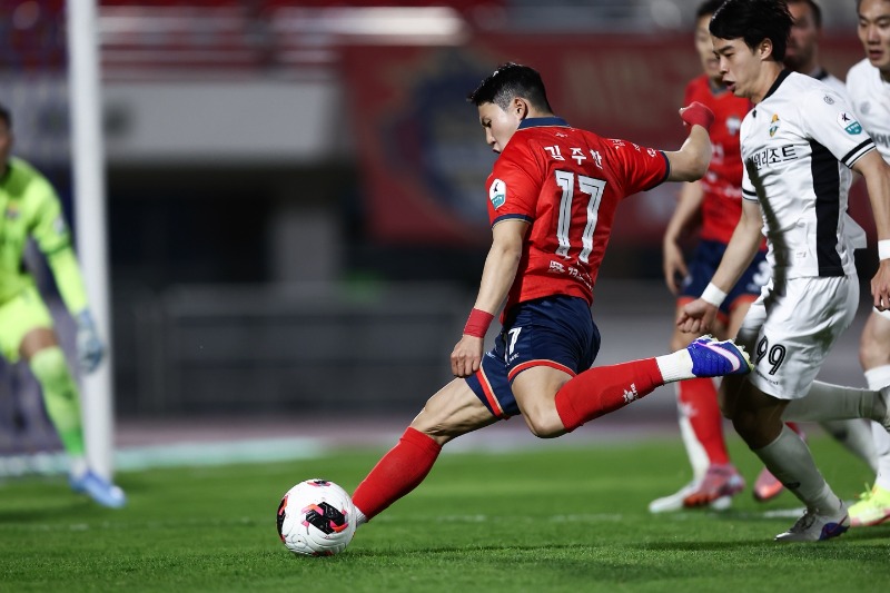 [사진=K league.4월 21일 강원전 홈경기에서 김천상무 김주찬이 슈팅을 시도하고 있다]